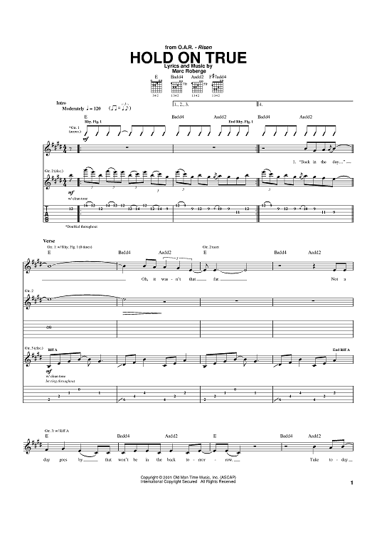 Digital Sheet Music for Hold On True by O.A.R., Marc Roberge scored for Guitar Tab; id:390259