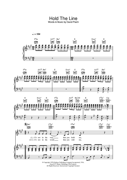 Digital Sheet Music for Hold The Line by Toto, David Paich scored for Piano/Vocal/Chords; id:389990