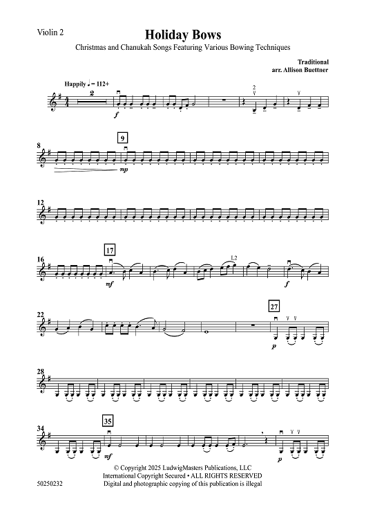 Digital Sheet Music for Holiday Bows - Violin 2 by Traditional, Allison Buettner scored for String Orchestra; id:508636