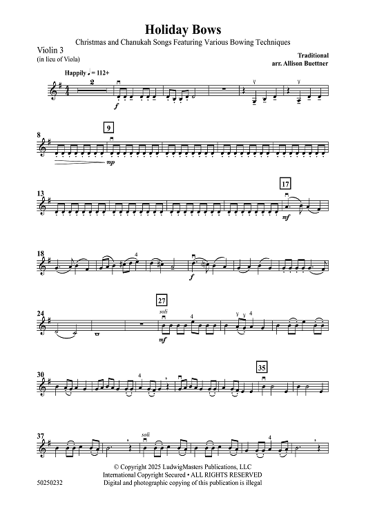 Digital Sheet Music for Holiday Bows - Violin 3 (for Viola) by Traditional, Allison Buettner scored for String Orchestra; id:508637