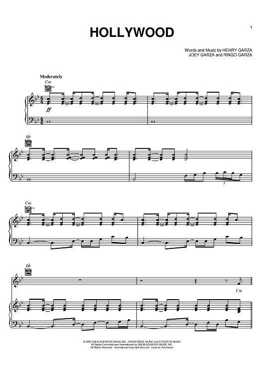 Digital Sheet Music for Hollywood by Henry Garza, Joey Garza, Ringo Garza, Los Lonely Boys scored for Piano/Vocal/Chords; id:380558