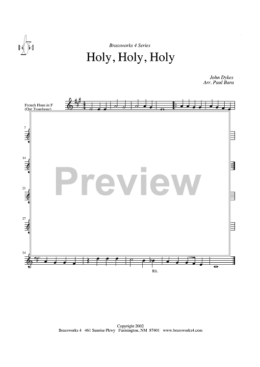Digital Sheet Music for Holy, Holy, Holy - Horn in F (opt. Trombone) by Paul Bara, John Bacchus Dykes scored for Brass Quartet; id:317125