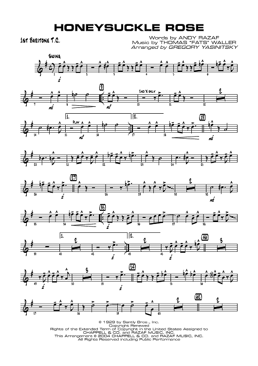 Digital Sheet Music for Honeysuckle Rose - Baritone 1 TC by Greg Yasinitsky, Andy Razaf, Thomas Waller scored for Jazz Ensemble; id:358927