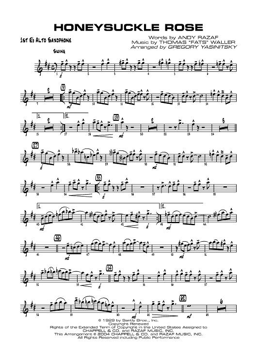 Digital Sheet Music for Honeysuckle Rose - E-flat Alto Saxophone 1 by Greg Yasinitsky, Andy Razaf, Thomas Waller scored for Jazz Ensemble; id:358913