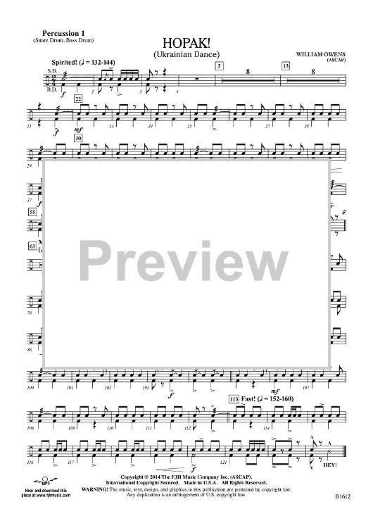Digital Sheet Music for Hopak! - Percussion 1 by William Owens scored for Concert Band; id:447905