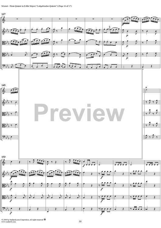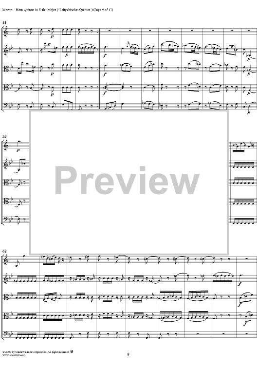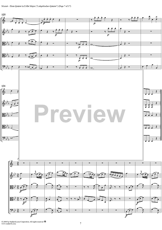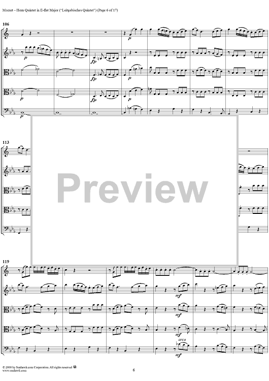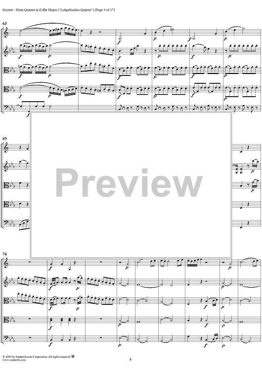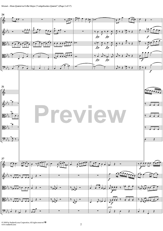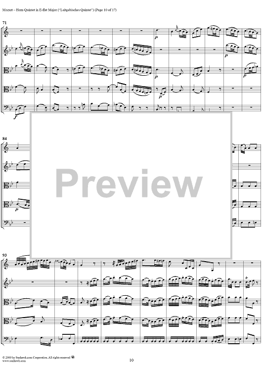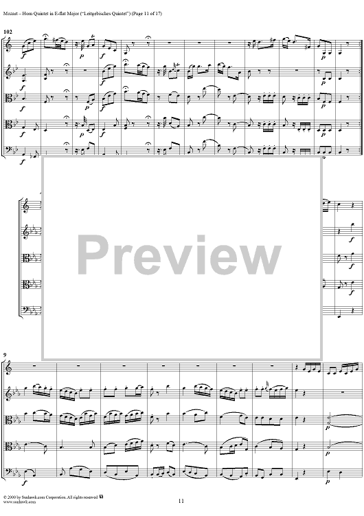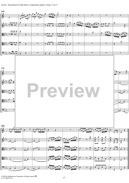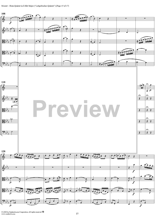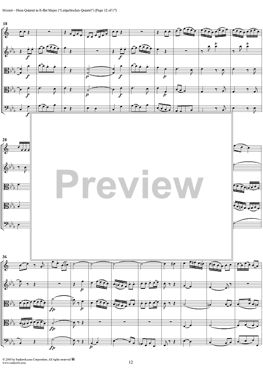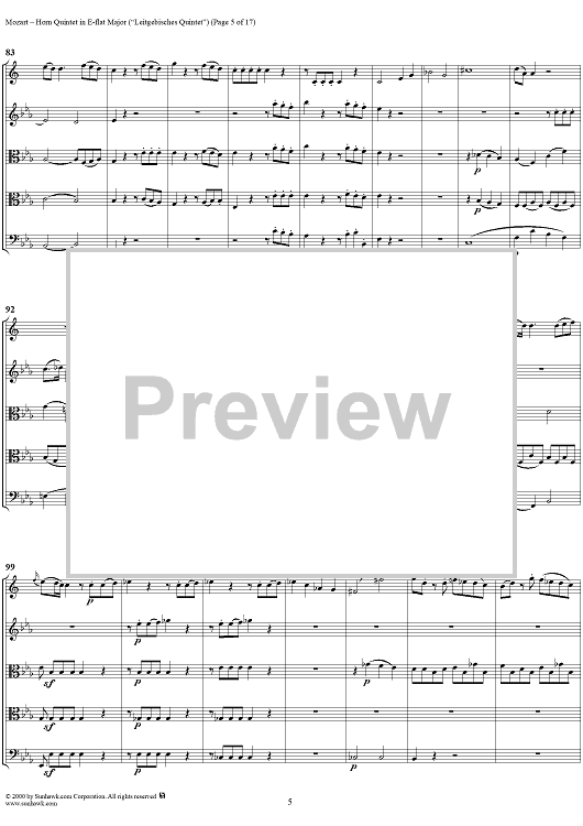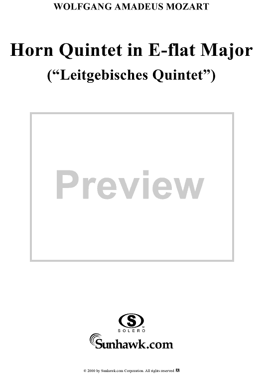 Digital Sheet Music for Horn Quintet in E-Flat Major, K407 (K386c) - Full Score by Wolfgang Amadeus Mozart scored for Horn/Violin/Two Violas/Cello; id:236025