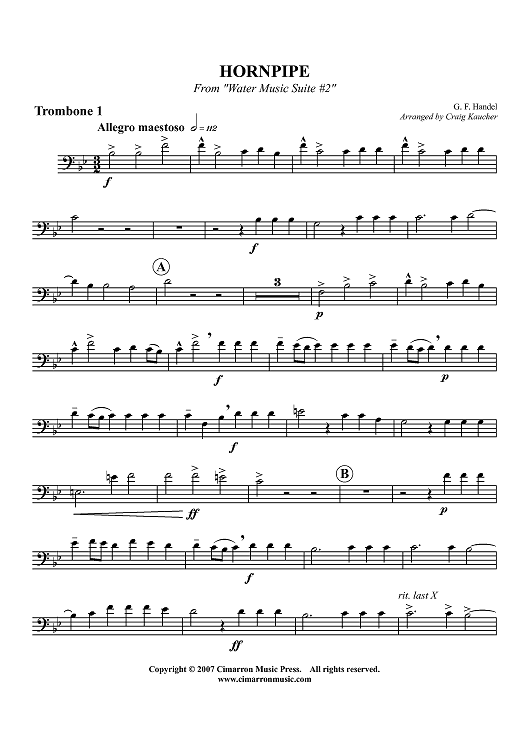 Digital Sheet Music for Hornpipe from "Water Music Suite #2" - Trombone 1 (opt. F Horn) by George Frideric Handel, Craig Kaucher scored for Brass Quartet; id:413906