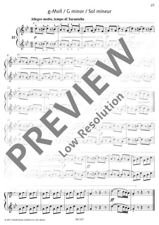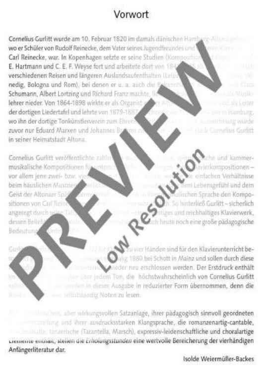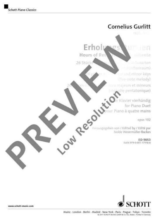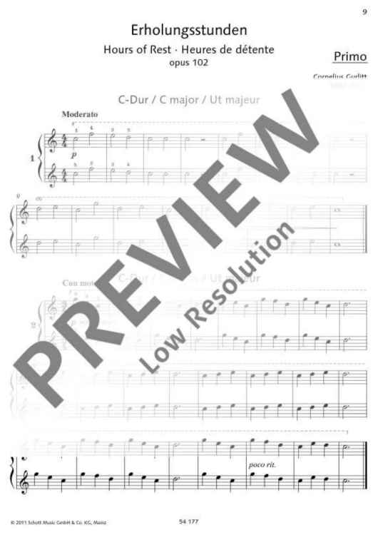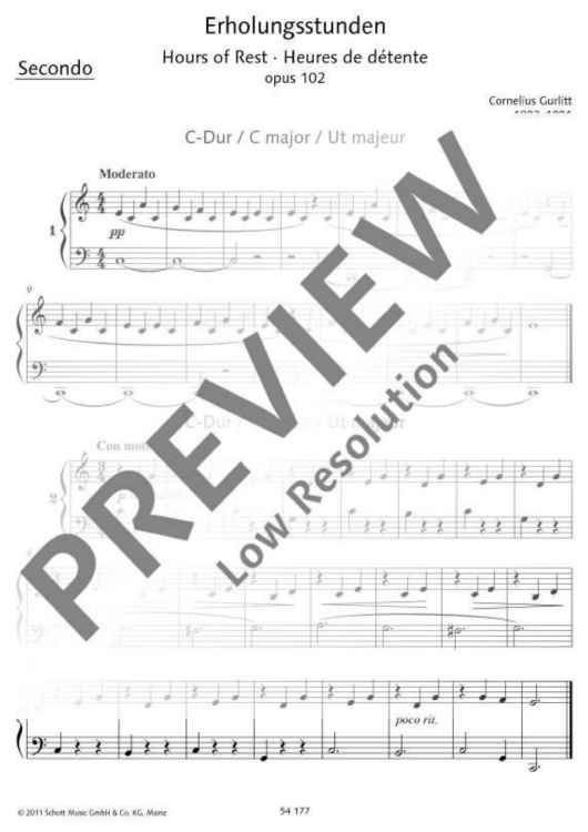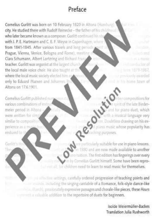 The popularity of Cornelius Gurlitt's (1820-1901) varied and abundant piano œuvre, certainly inspired by his work as a music teacher, is undiminished until today and still of great educational significance in music lessons. The musical language of his four-handed piano miniatures is very similar to that of the compositions by Carl Reinecke and Theodor Kirchner. 'Hours of rest' was published for the first time by Schott in 1880 and shall now be made accessible again for music lessons with this new edition. The miniatures have a simple, yet effective structure, are arranged in an educationally sensible way and have an expressive tonal language containing cantabile, folk-song-like, dance-like, expressive and chorale-like elements. Everything that makes beginner's lessons sensible and systematic is dealt with in these 26 varied miniatures; in particular, the pupils are made familiar with all major and minor modes. As in Diabelli's famous 'Melodious Exercises', the primo part is played within the pentatonic scale, thus being perfect for beginners. The demands for the secondo player are somewhat higher. A valuable addition to the piano duet repertoire.