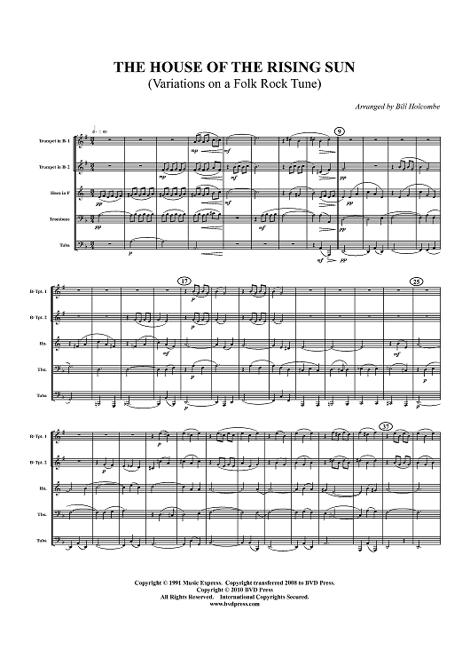 Digital Sheet Music for House of the Rising Sun (Variations on a Folk Rock Tune) - Score by , Traditional, Bill Holcombe scored for Brass Quintet; id:411785