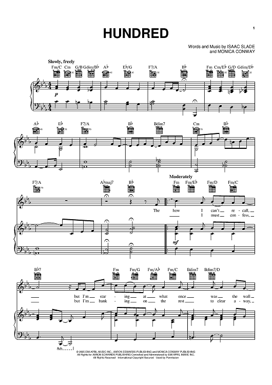 Digital Sheet Music for Hundred by Isaac Slade, The Fray, Monica Conway scored for Piano/Vocal/Chords; id:391723