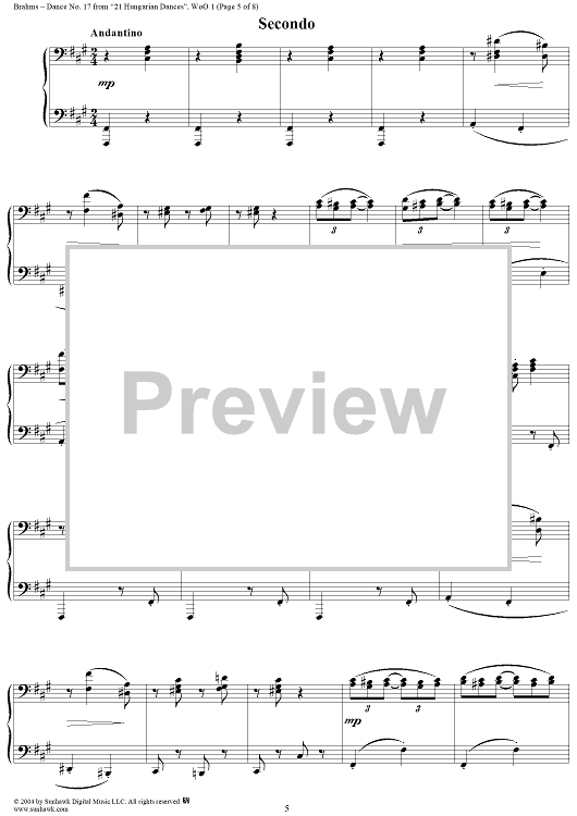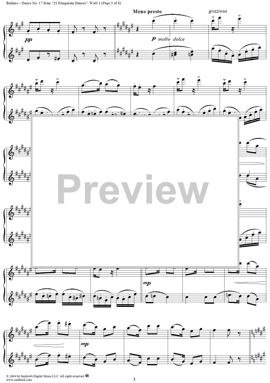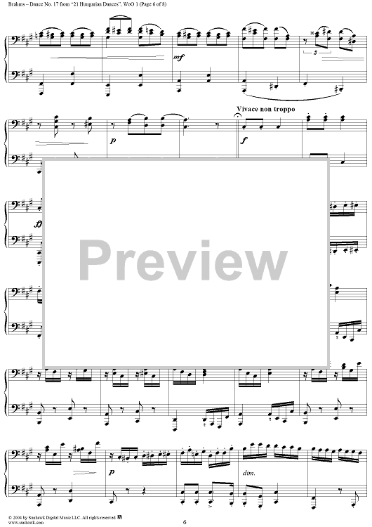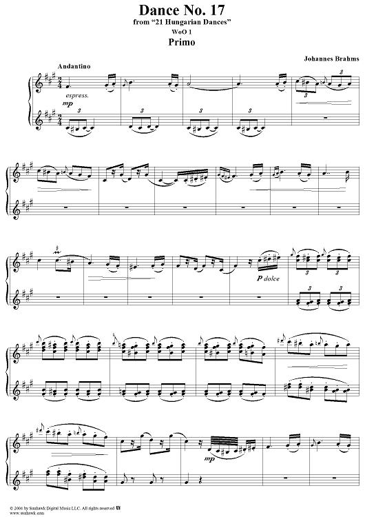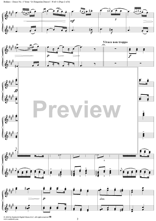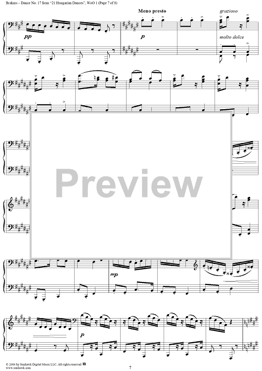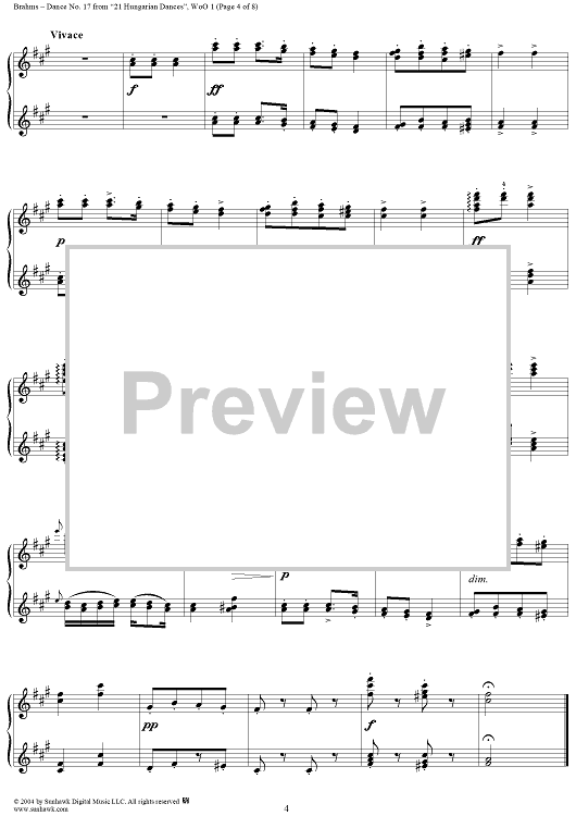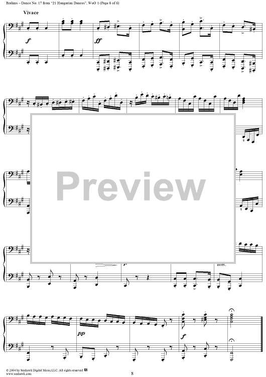 Digital Sheet Music for Hungarian Dance No. 17 by Johannes Brahms scored for 1 Piano, 4 Hands; id:296568