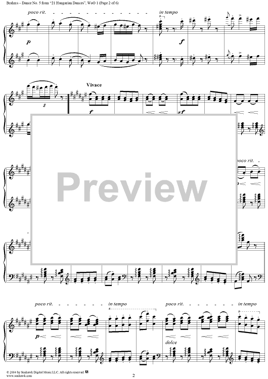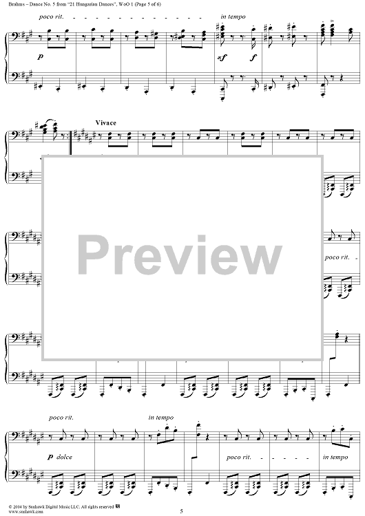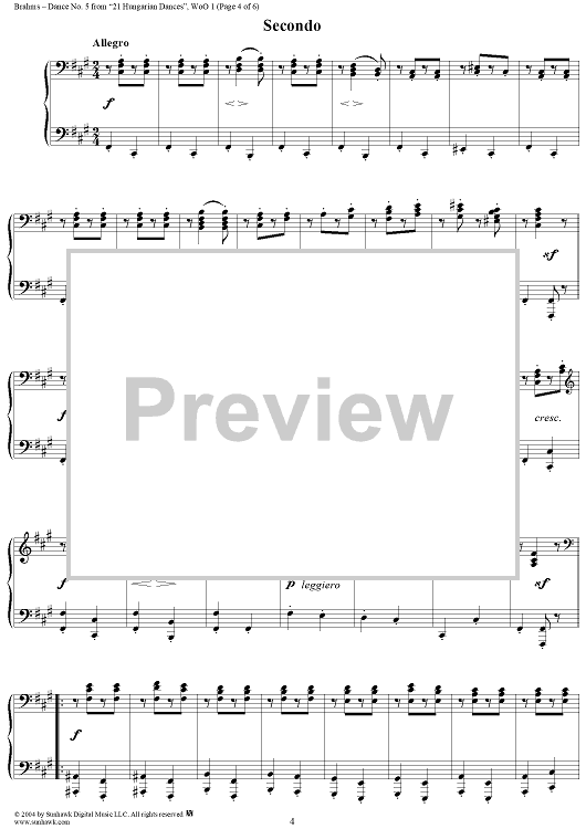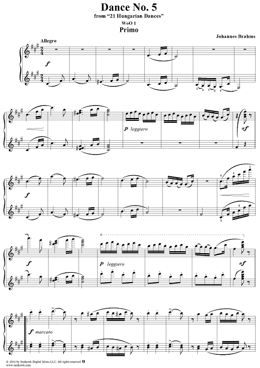 Digital Sheet Music for Hungarian Dance No. 5 by Johannes Brahms scored for 1 Piano, 4 Hands; id:296556