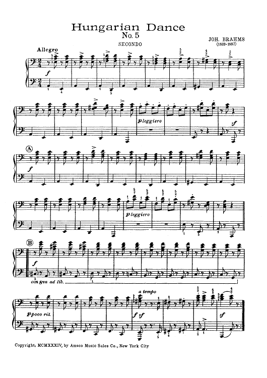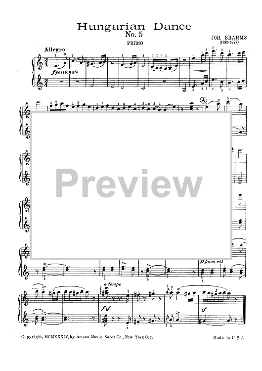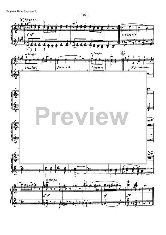 Digital Sheet Music for Hungarian Dance No. 5 by Johannes Brahms scored for 1 Piano, 4 Hands; id:460863