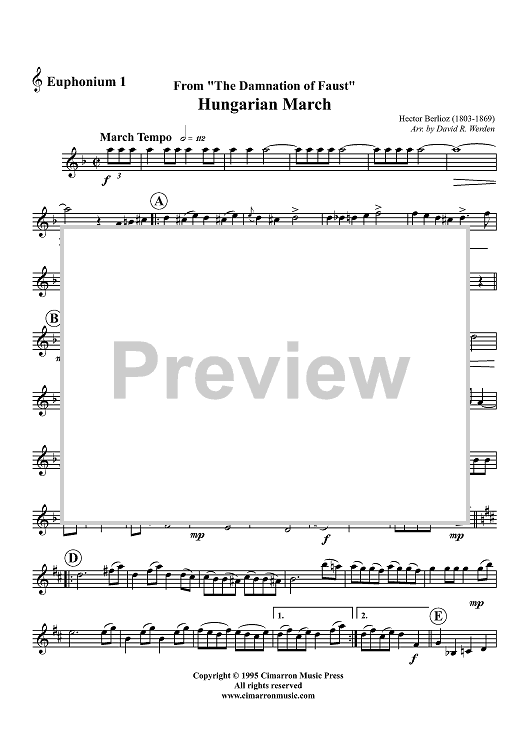 Digital Sheet Music for Hungarian March - Euphonium 1 BC/TC by Hector Berlioz, David Werden scored for Tuba Quartet; id:320711