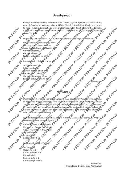 This arrangement written by Nicolas Prost in 2016 is a free reconstitution of the lost work Hymne sacré pour les instruments de Sax (Sacred song for the instruments of Sax), which was first performed at the Hertz concert hall in Paris on 3 February 1844. Adolphe Sax himself played the saxophone part. It was the first time that this instrument was played in a concert. The piece performed was an arrangement of Chant sacré for six voices and piano composed by Berlioz in December 1843.