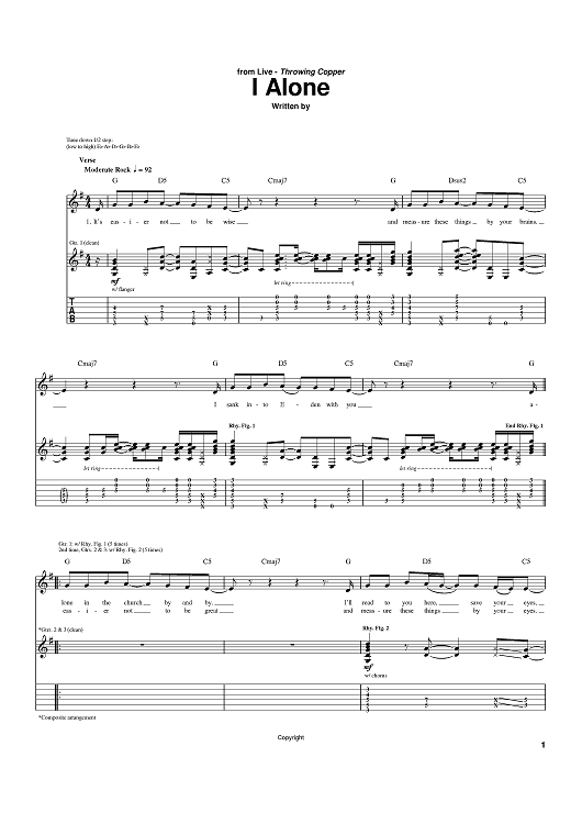 Digital Sheet Music for I Alone by Live, Edward Kowalczyk, Chad Taylor, Patrick Dahlheimer, Chad Gracey scored for Guitar Tab; id:393474