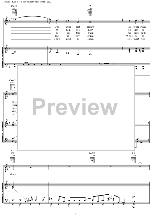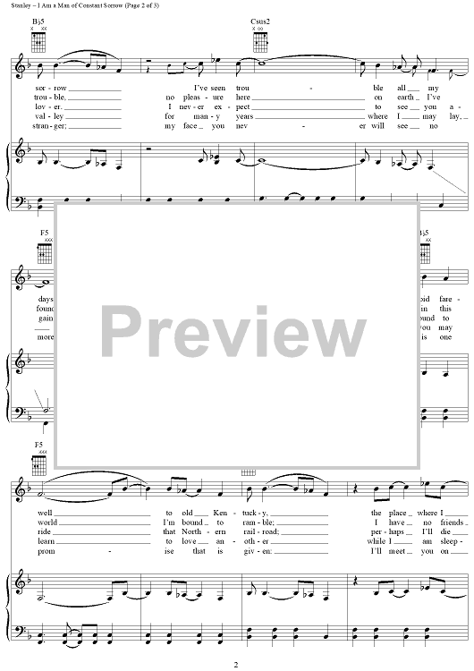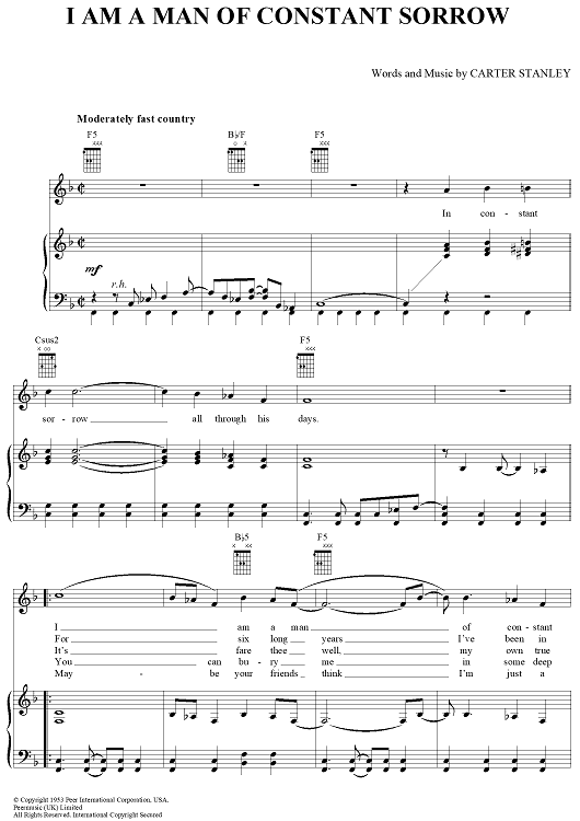 Digital Sheet Music for I Am A Man Of Constant Sorrow by Carter Stanley, The Soggy Bottom Boys scored for Piano/Vocal/Chords; id:387982