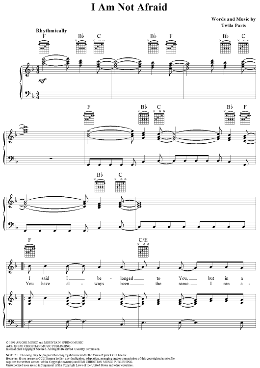 Digital Sheet Music for I Am Not Afraid by Twila Paris scored for Piano/Vocal/Chords; id:241428