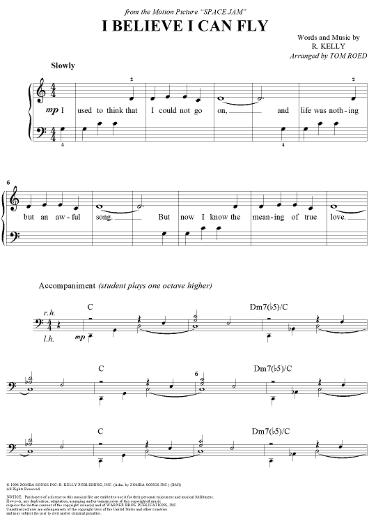 Digital Sheet Music for I Believe I Can Fly by Tom Roed, R. Kelly scored for Easy Piano/Vocal; id:286272