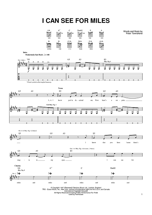 Digital Sheet Music for I Can See For Miles by The Who, Peter Townshend scored for Easy Guitar Tab; id:396578
