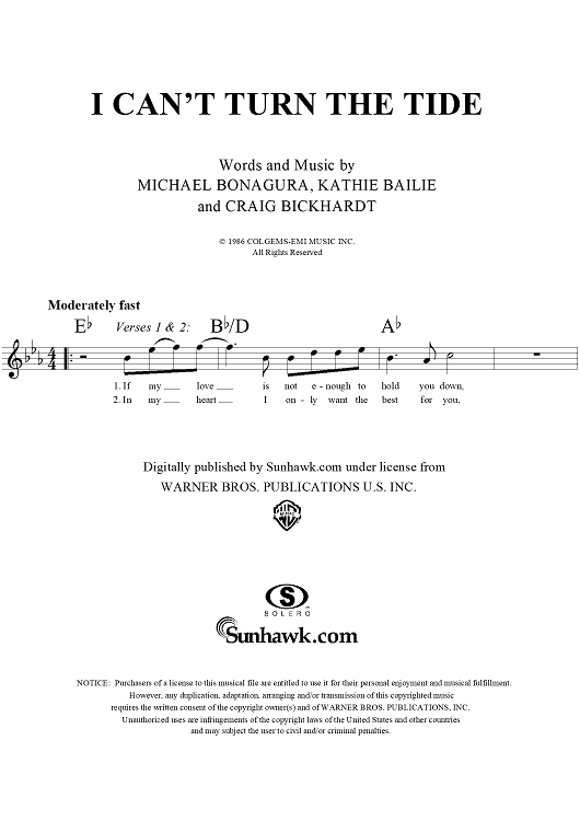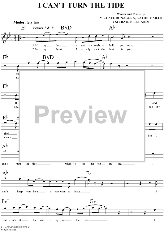 Digital Sheet Music for I Can't Turn The Tide by Kathie Baillie, Michael Bonagura, Craig Bickhardt, Baillie and the Boys scored for Lead Sheet; id:241756