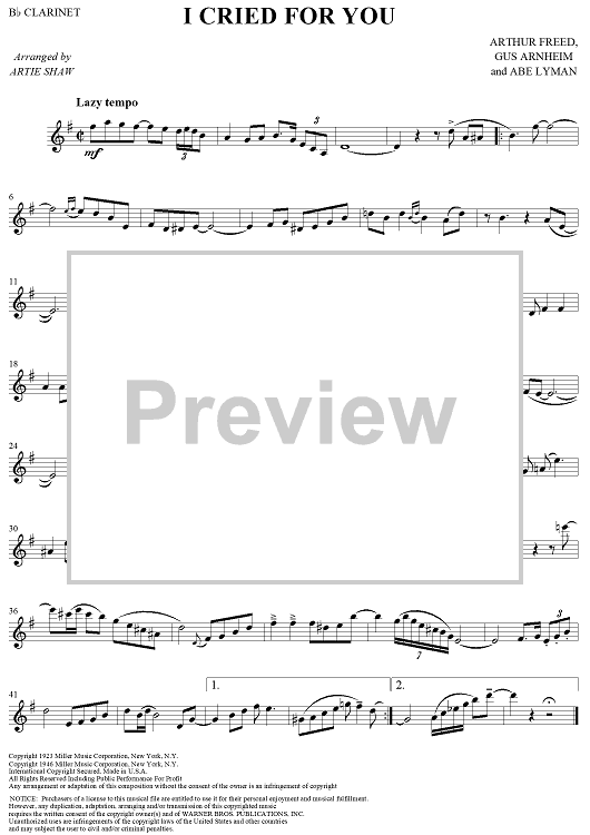 Digital Sheet Music for I Cried for You - Clarinet by , Artie Shaw, Abe Lyman, Gus Arnheim, Arthur Freed scored for Clarinet; id:355845