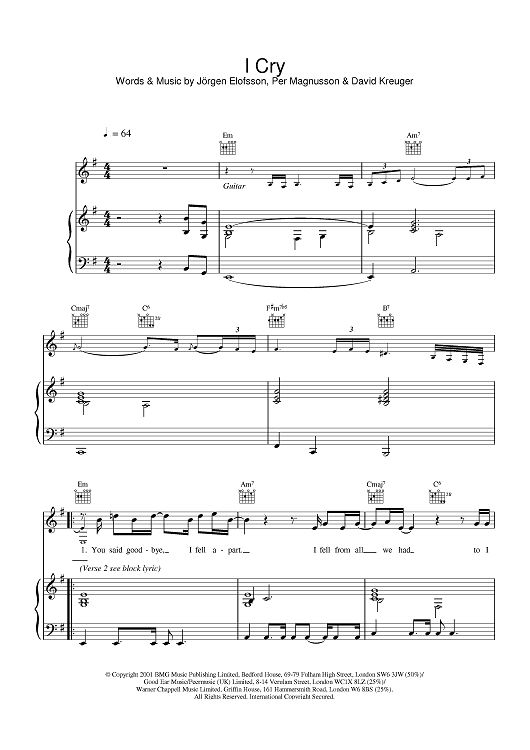Digital Sheet Music for I Cry by Jörgen Elofsson, David Kreuger, Per Magnusson, Westlife scored for Piano/Vocal/Chords; id:380163
