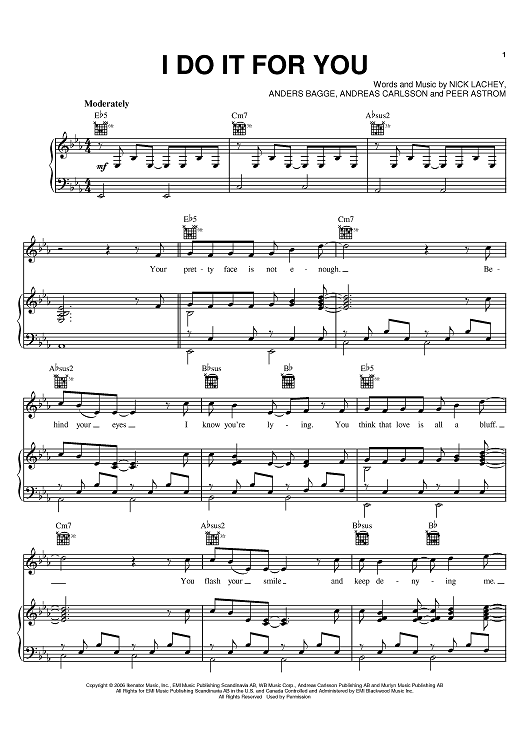 Digital Sheet Music for I Do It For You by Andreas Carlsson, Nick Lachey, Peer Astrom, Anders Bagge scored for Piano/Vocal/Chords; id:401841