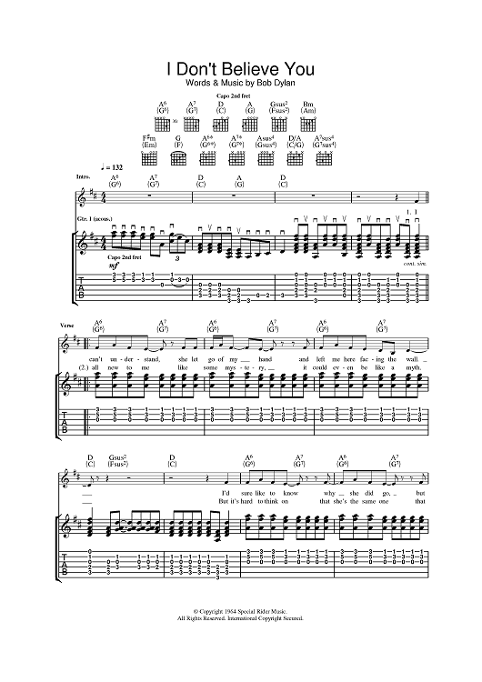 Digital Sheet Music for I Don't Believe You by Bob Dylan scored for Guitar Tab; id:380801