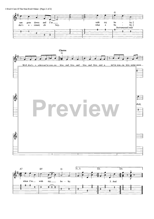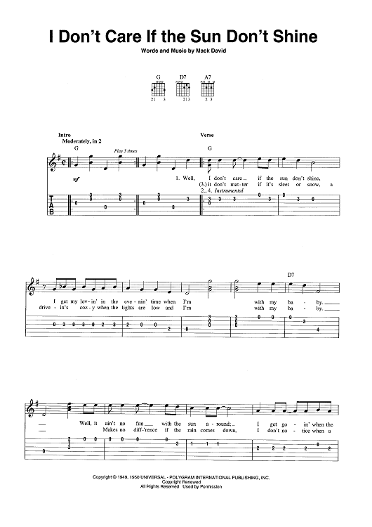 Digital Sheet Music for I Don't Care If the Sun Don't Shine by Mack David, Patti Page scored for Easy Guitar Tab/Vocal/Chords; id:456761