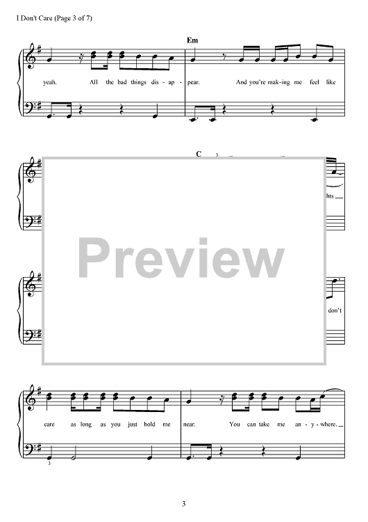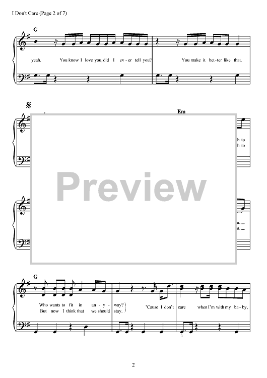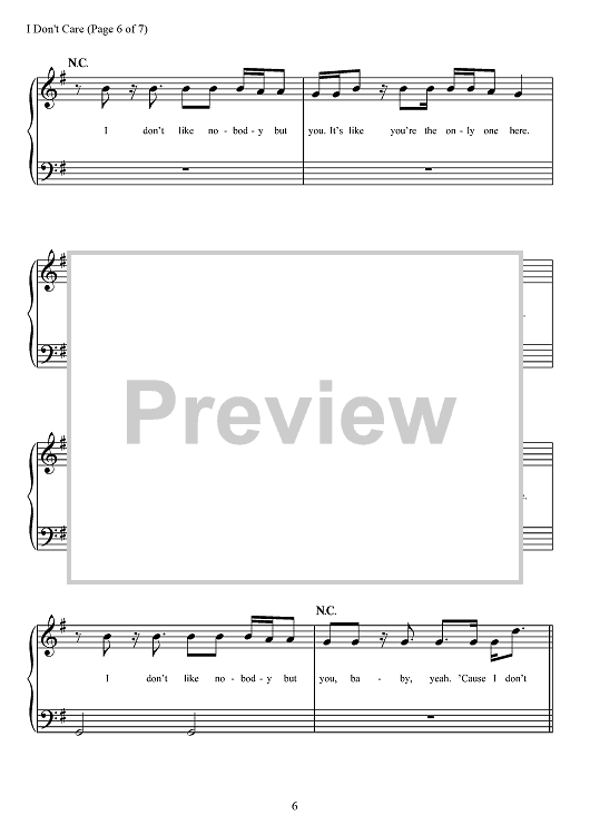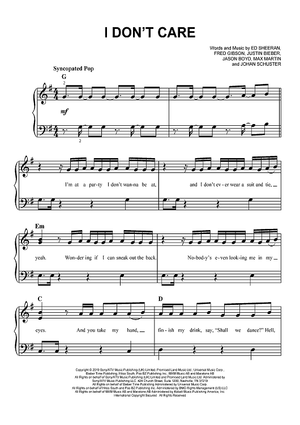 Digital Sheet Music for I Don't Care by Max Martin, Jason Boyd, Justin Bieber, Johan Schuster, Ed Sheeran, Fred Gibson scored for Easy Piano/Vocal/Chords; id:467546