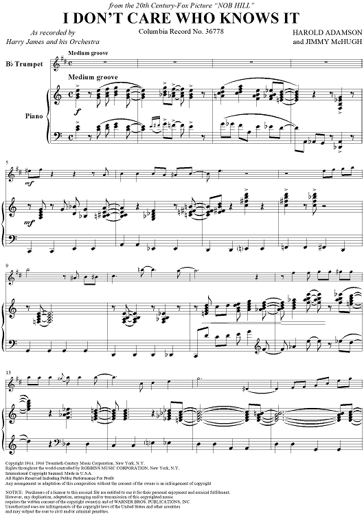 Digital Sheet Music for I Don't Care Who Knows It - Piano Score by Jimmy McHugh, Harold Adamson, Harry James and His Orchestra scored for Trumpet/Piano; id:355837