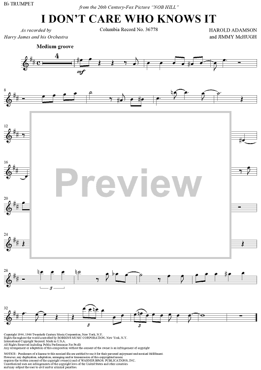 Digital Sheet Music for I Don't Care Who Knows It - Trumpet by , Jimmy McHugh, Harold Adamson, Harry James and His Orchestra scored for Trumpet/Piano; id:355836