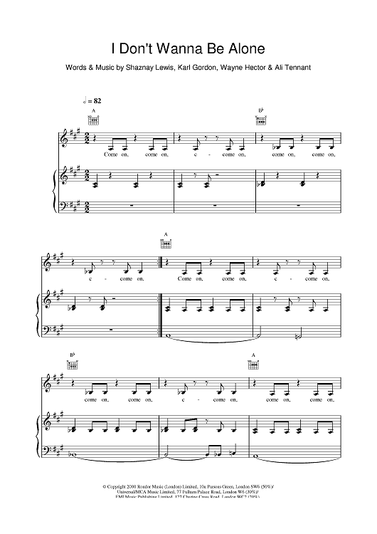 Digital Sheet Music for I Don't Wanna Be Alone by Shaznay Lewis, Wayne Hector, All Saints, Karl Gordon scored for Piano/Vocal/Chords; id:380013