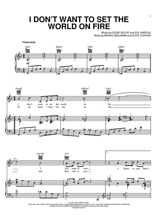 Digital Sheet Music for I Don't Want To Set The World On Fire by The Ink Spots, Eddie Durham, Bennie Benjamin, Sol Marcus, Eddie Seiler scored for Piano/Vocal/Chords; id:381871