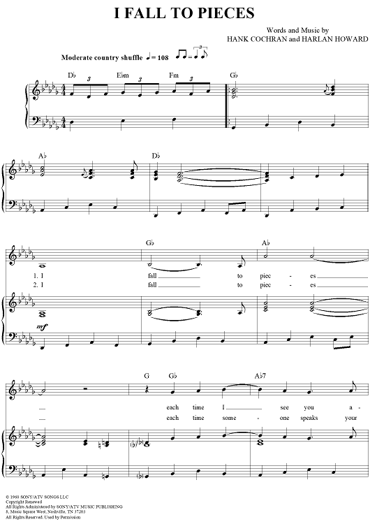 Digital Sheet Music for I Fall To Pieces by Patsy Cline, Harlan Howard, Hank Cochran scored for Piano/Vocal/Chords; id:361789
