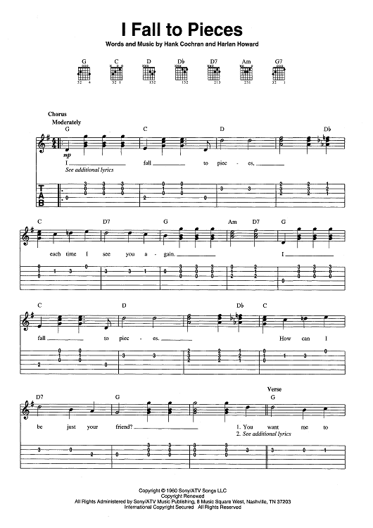 Digital Sheet Music for I Fall To Pieces by Patsy Cline, Harlan Howard, Hank Cochran scored for Easy Guitar Tab/Vocal; id:441437