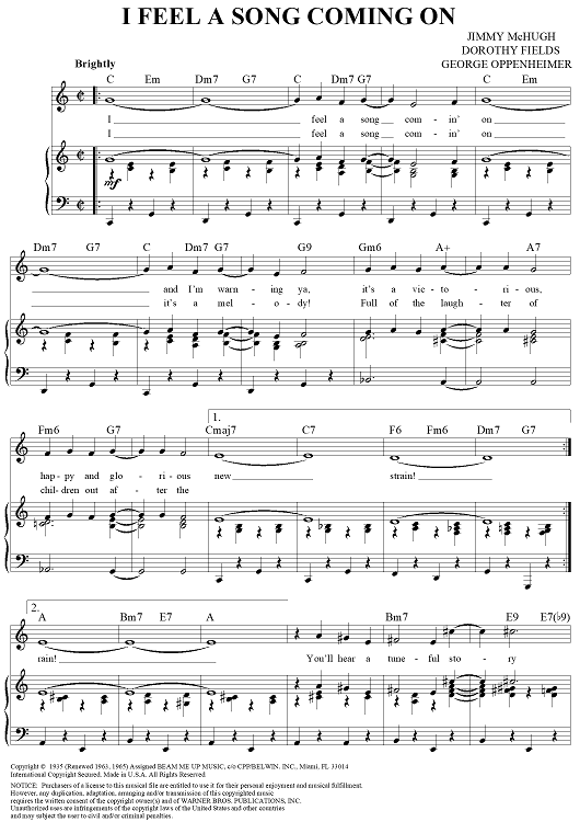 Digital Sheet Music for I Feel a Song Coming On by Dorothy Fields, Jimmy McHugh, George Oppenheimer scored for Piano/Vocal/Chords; id:251902