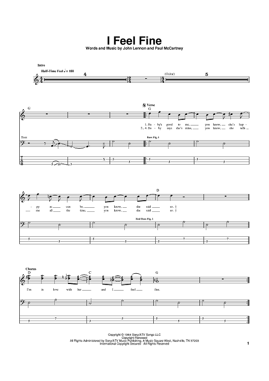 Digital Sheet Music for I Feel Fine by Paul McCartney, The Beatles, John Lennon scored for Bass Tab; id:369527