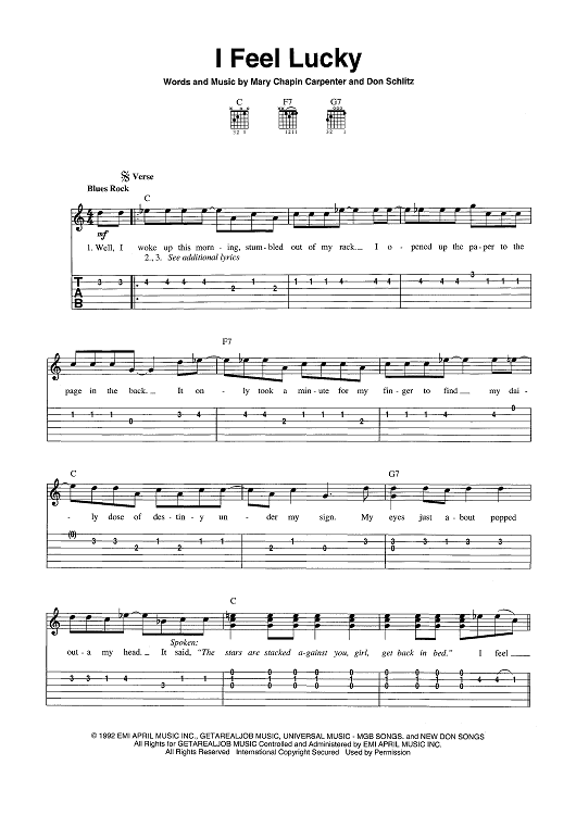 Digital Sheet Music for I Feel Lucky by Mary Chapin Carpenter, Don Schlitz scored for Easy Guitar Tab/Vocal/Chords; id:456771