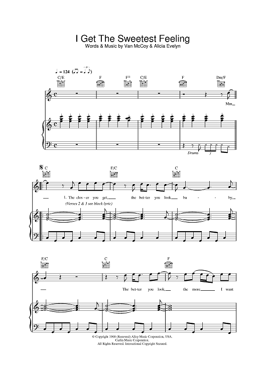 Digital Sheet Music for I Get The Sweetest Feeling by Jackie Wilson, Van McCoy, Alicia Evelyn scored for Piano/Vocal/Chords; id:388771