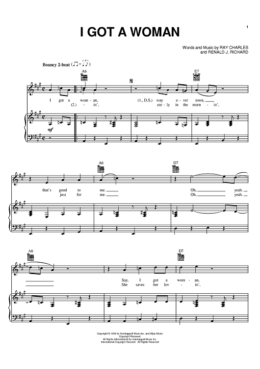 Digital Sheet Music for I Got A Woman by Ray Charles, Renald J. Richard scored for Piano/Vocal/Chords; id:384806