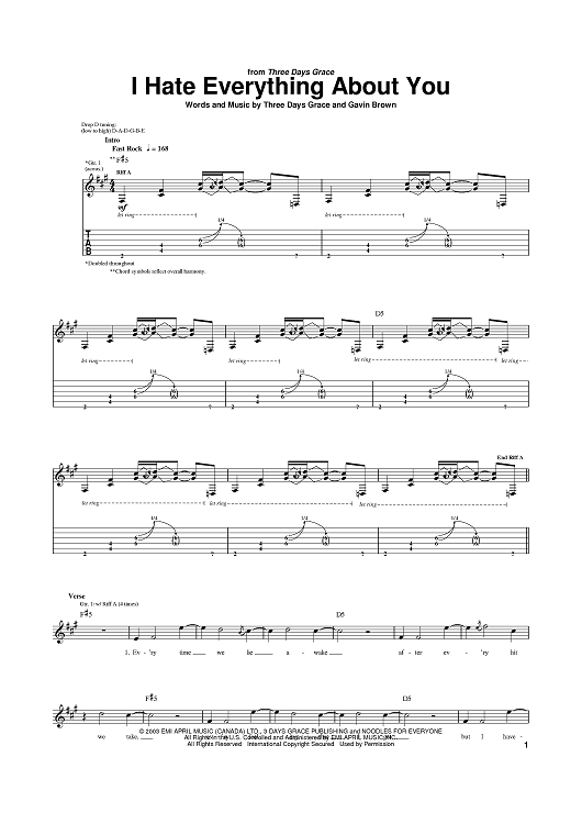 "I Hate Everything About You" Sheet Music by Three Days Grace