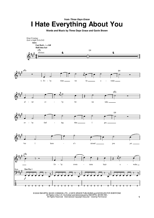 "I Hate Everything About You" Sheet Music by Three Days Grace