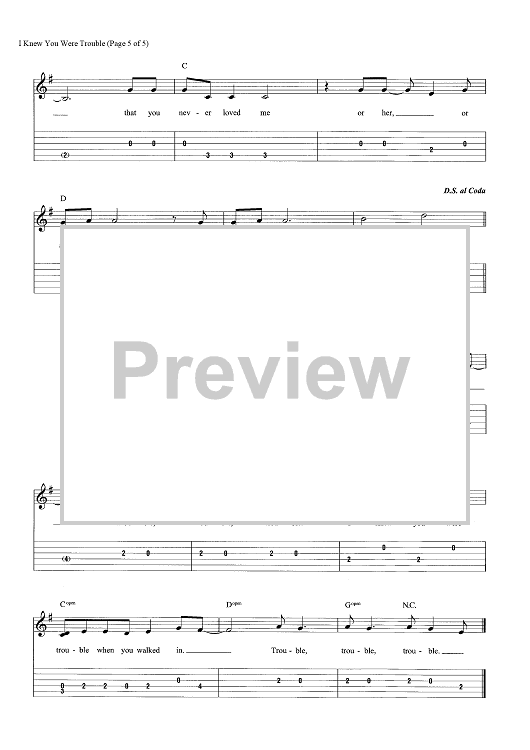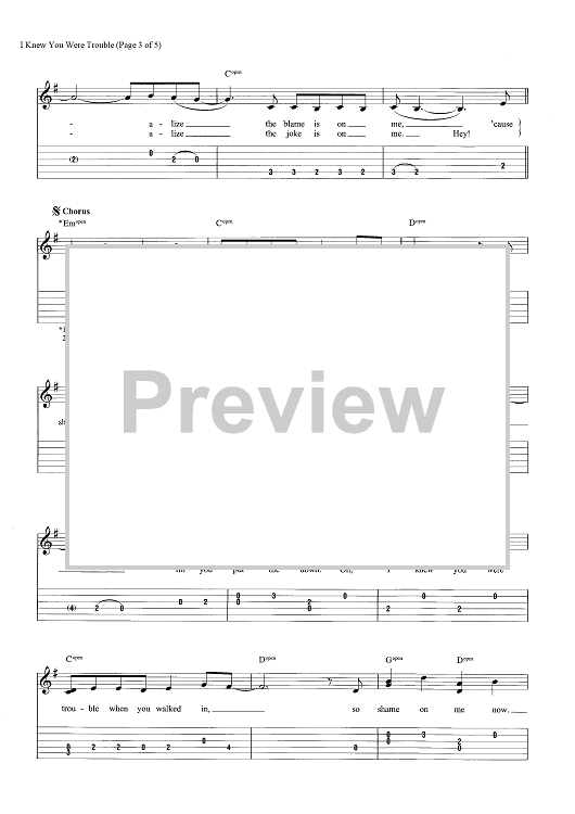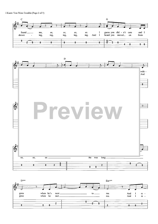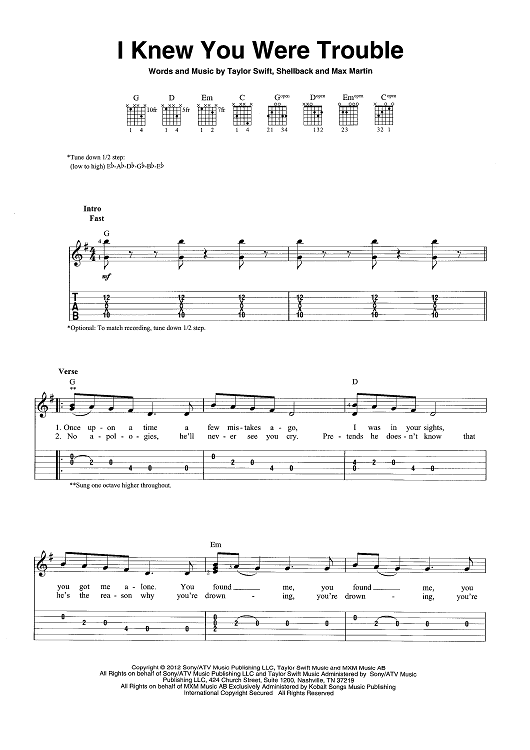 Digital Sheet Music for I Knew You Were Trouble by Max Martin, Taylor Swift, Shellback scored for Easy Guitar Tab/Vocal; id:466115