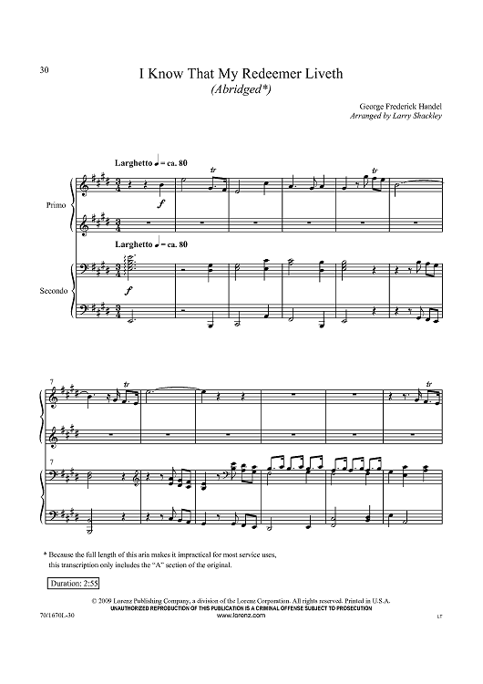 Digital Sheet Music for I Know That My Redeemer Liveth (Abridged) by George Frideric Handel, Larry Shackley scored for Piano Duet; id:433834
