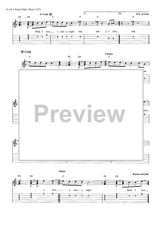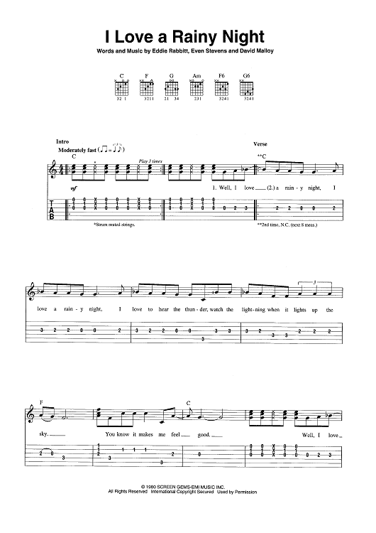 Digital Sheet Music for I Love a Rainy Night by David Malloy, Even Stevens, Eddie Rabbitt scored for Easy Guitar Tab/Vocal/Chords; id:456701