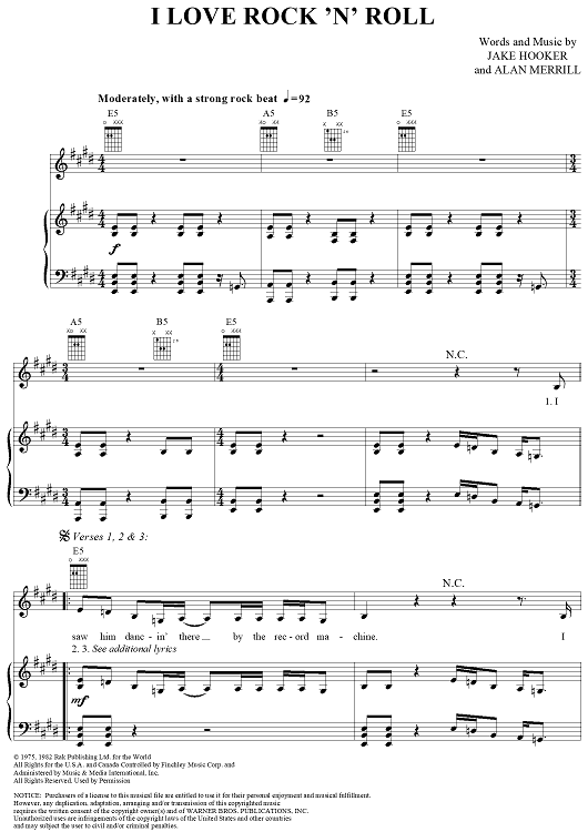 Digital Sheet Music for I Love Rock 'n' Roll by Alan Merrill, Jake Hooker scored for Piano/Vocal/Chords; id:286571