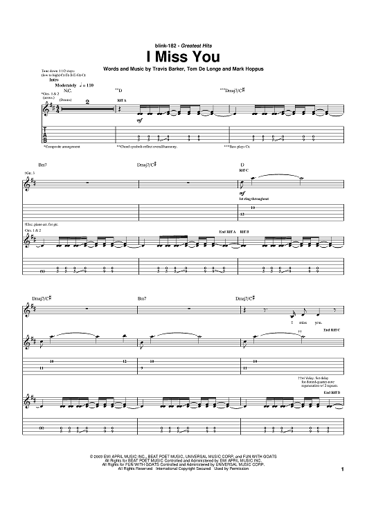 Digital Sheet Music for I Miss You by Travis Barker, Mark Hoppus, blink-182, Tom DeLonge scored for Guitar Tab; id:373355