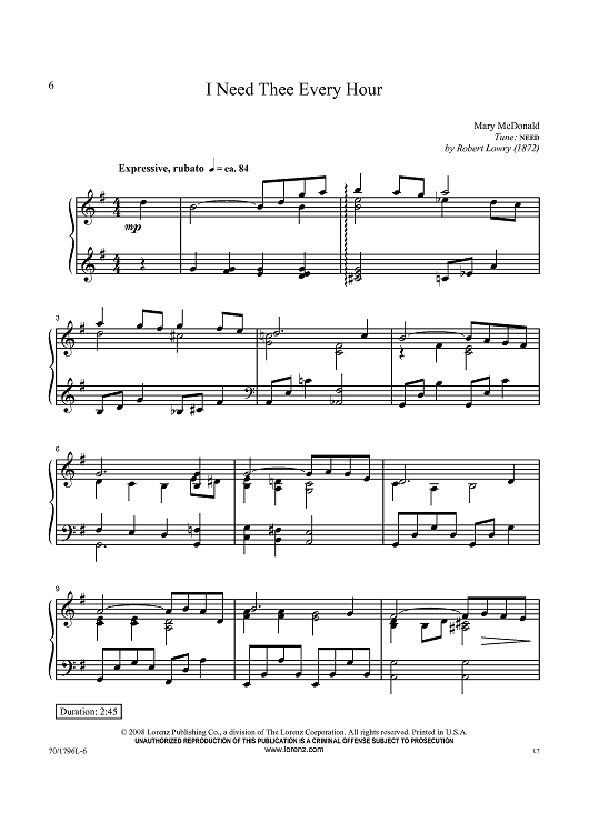 Digital Sheet Music for I Need Thee Every Hour by Robert Lowry, Mary McDonald scored for Piano Solo; id:433688